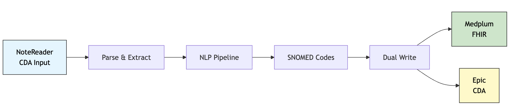 A clinical note arrives from NoteReader as CDA XML → gets parsed and processed through scispacy → entities are linked to SNOMED CT codes → converted to FHIR Condition resources → written to both Medplum (modern FHIR) and back to Epic (legacy CDA).